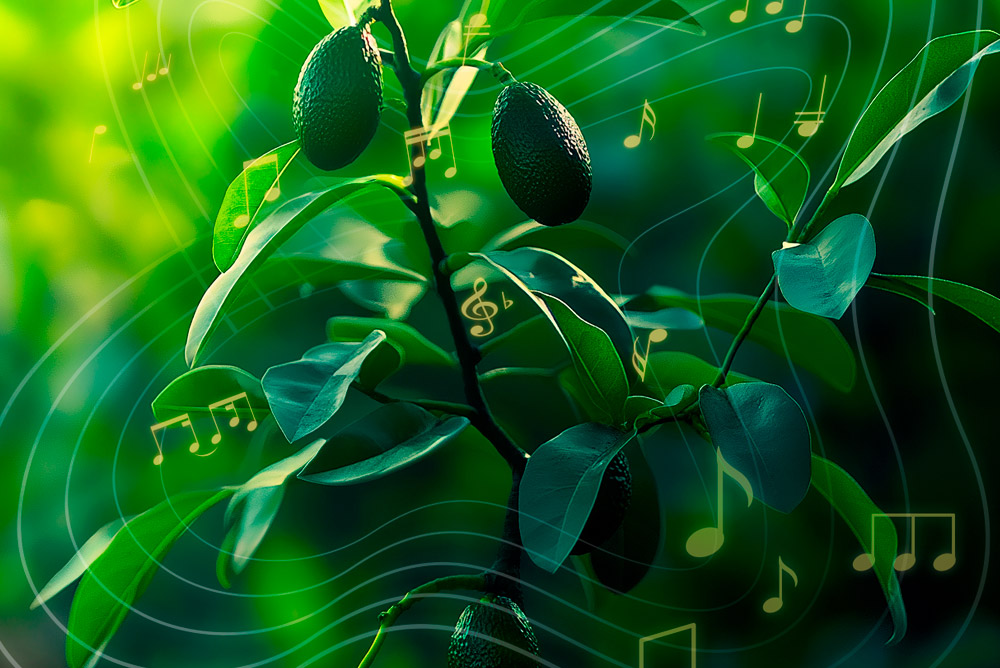 En nuestras fincas, los aguacateros “escuchan día y noche” una sinfonía natural muy especial que tras años de investigación hemos creado específicamente para ellos. El suave canto de los pájaros y el murmullo del agua fluyen y se integran con campos de frecuencias en un rango que va desde los 420Hz hasta los 1100Hz. “Es como una nana maravillosa que les cantamos cada día a nuestras plantas”